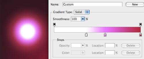 首先創建一個漂亮的背景。新建一個ps文檔,背景填充為黑色(D→Alt+Delete)。創建一個新圖層(Ctrl+Alt+Shift+N)并填充為白色(D→Ctrl+Delete)。下面將用“光照效果”濾鏡(濾鏡》渲染》光照效果)在這層上制作柔美的漸變效果。在強度調節旁邊,選擇你喜歡的任意顏色只要有一些深的顏色就可以。比如,我選擇了深粉色/紫色。